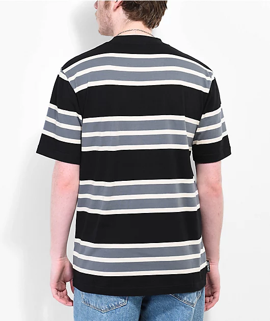 This Oval Dot Santa Cruz t-shirt comes in a black colorway with tan and grey horizontal stripes throughout and an embroidered Dot logo on the left of chest. This shirt is made of 100% cotton with a regular fit for comfortable, all day wear.