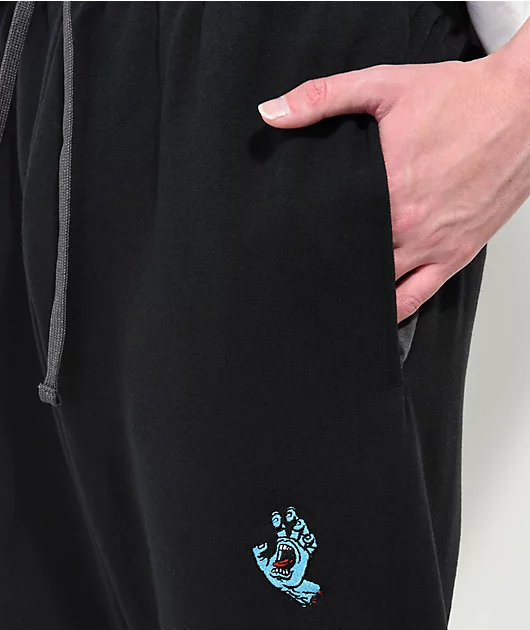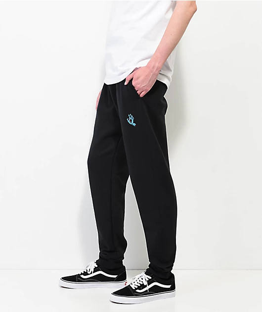 In a sleek black colorway comes the Simplified Hand sweatpants from Santa Cruz, displaying an embroidered image of the Santa Cruz screaming hand in a blue detailing that stands out. These soft and durable cotton-poly sweats feature dual slash hand pockets