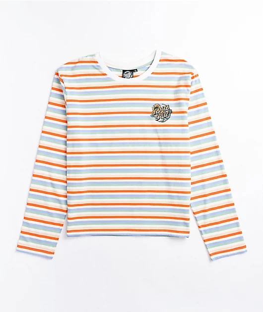 Keep your outfits cute and colorful with Santa Cruz’s Sunflower Dot orange and white stripe long sleeve t-shirt! Pastel orange, green, blue, and white stripes throughout the shirt lend the look some subtle summery color, while the all-cotton construction