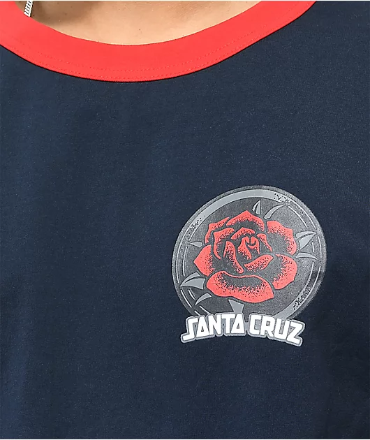 The Til The End Ringer Santa Cruz t-shirt is made from lightweight, durable cotton, and comes in a navy colorway with thick, contrasting red sleeves on the collar and sleeves. Screen-printed on the left of the chest is a graphic of a rose, and on the back