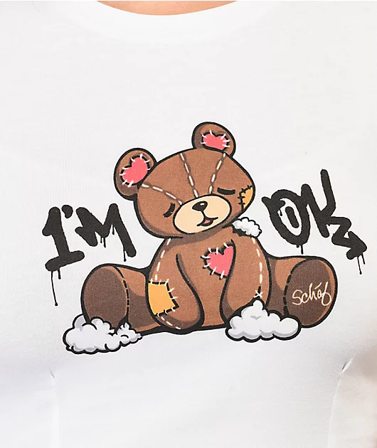 The I’m Ok crop Schaf t-shirt is made of 100% cotton and comes in a white colorway with a screen-printed graphic on the front, boasting an adorable teddy bear with ripped and patched up seams.