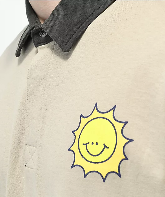 From the Select Start x Dreyfus collaboration comes the Mom Nature rugby shirt in beige with a black rugby collar featuring a 3-button construction and long sleeves. Screen-printed on the front of the shirt is a sun along with text reading, \”Mother nature