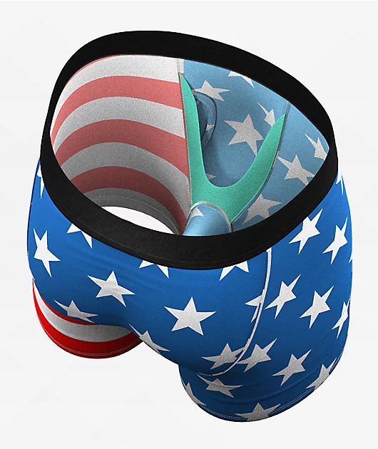 The Mascot Ball Hammock boxer briefs from Shinesty feature a black, elastic waistband as well as sublimated graphics of the American flag and an eagle throughout the legs. These boxer briefs are made of luxury MicroModal fabric