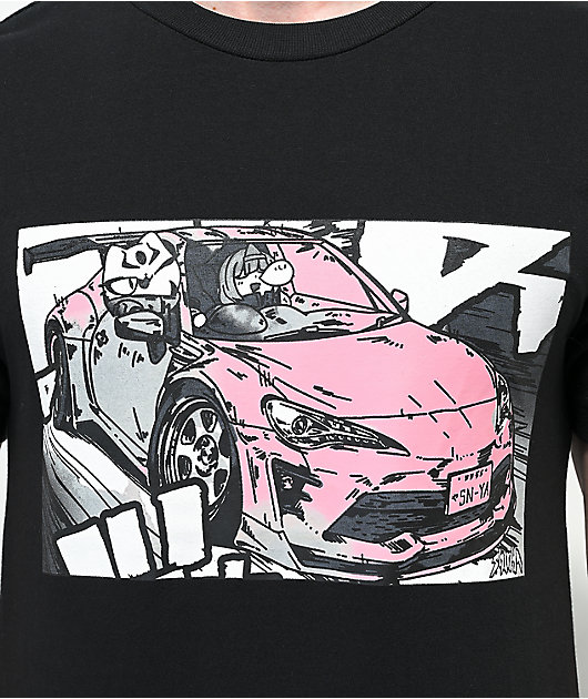 Shinya Drift Black T-Shirt The Drift t-shirt from Shinya is made from incredibly soft and lightweight cotton, and comes in a timeless black colorway. Screen-printed on the chest is a graphic of a streetcar driven by two anime-style characters .