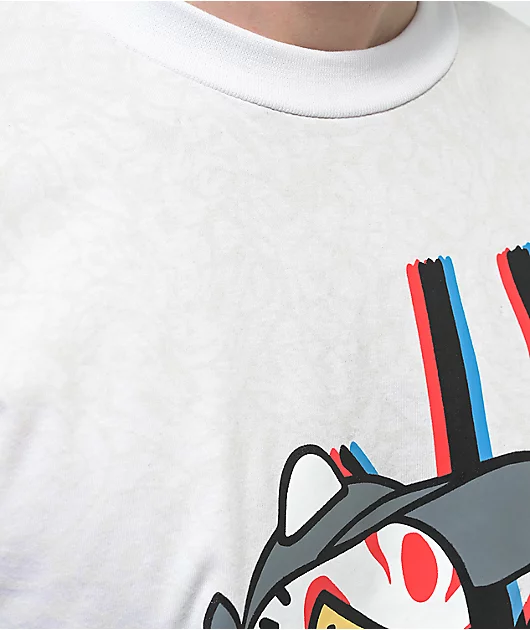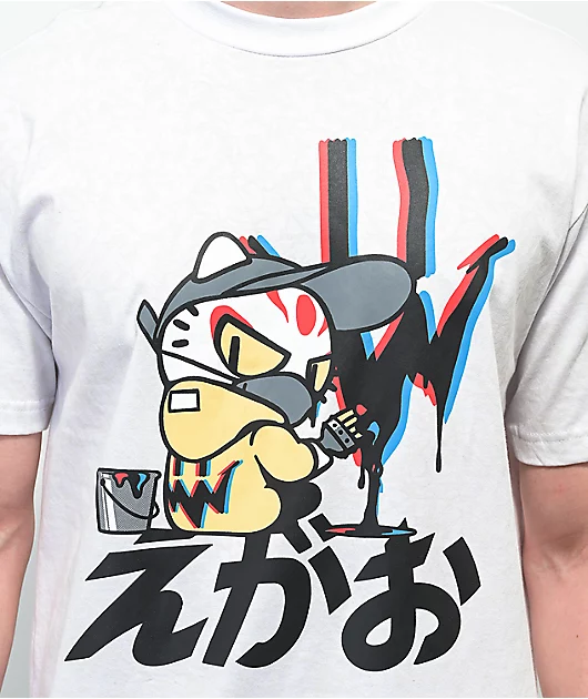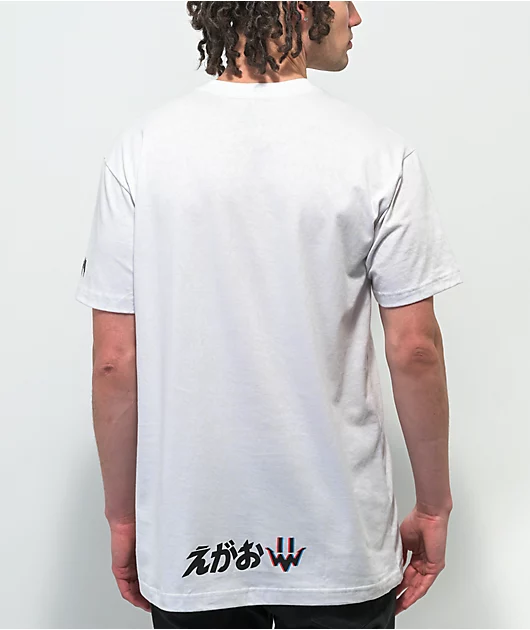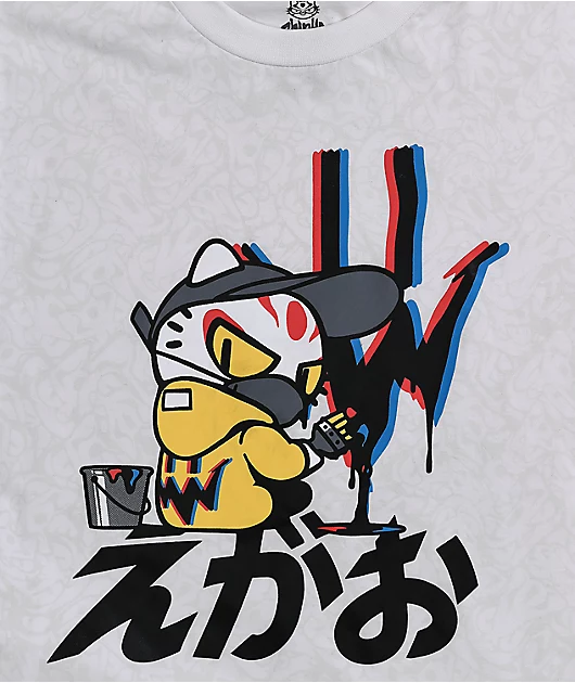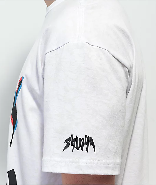 The Smile t-shirt from Shinya features a white colorway with off-white graffiti pattern throughout the teen, and a screen-printed graphic of a Shinya anime character. The shirt is constructed from an extremely soft cotton and has a relaxed, regular tee fi