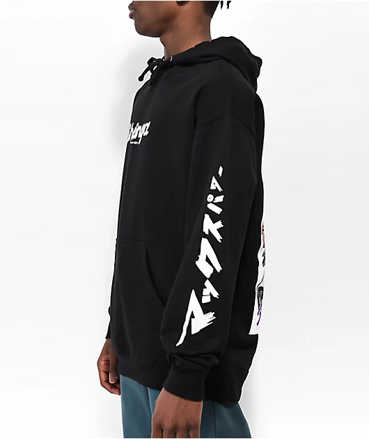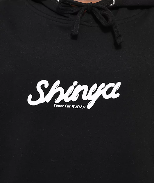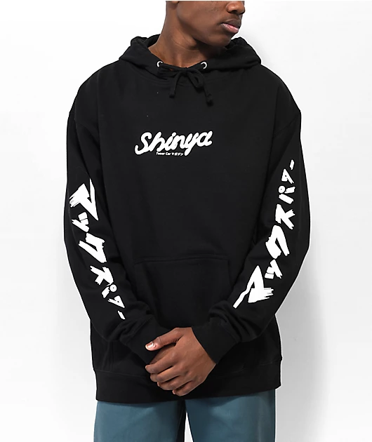 Shinya brings the Showdown hoodie in a sleek black colorway, showing off the brand name across the chest in white for contrast and the graphic of an animated character driving a tuned up pizza delivery car on the back. This statement hoodie is made from a