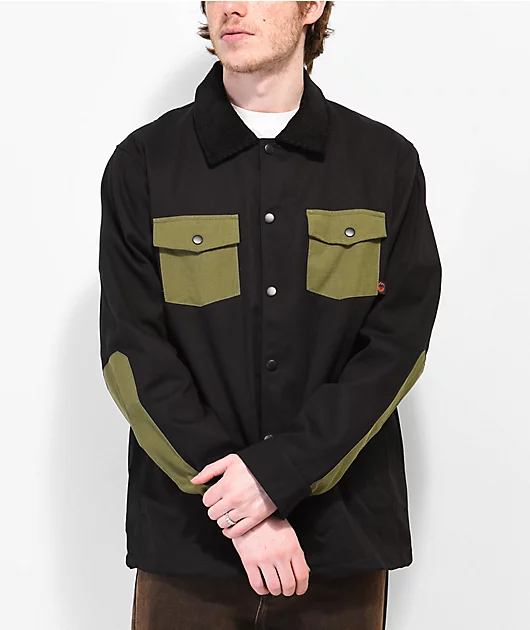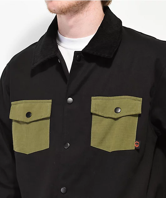 The Classic Swirl Spitfire jacket comes in a black colorway with green accents including dual chest pockets and a back screen-printed graphic of a green swirl with \”The end\” in the middle. This jacket has dual button up closure with a corduroy turndown co