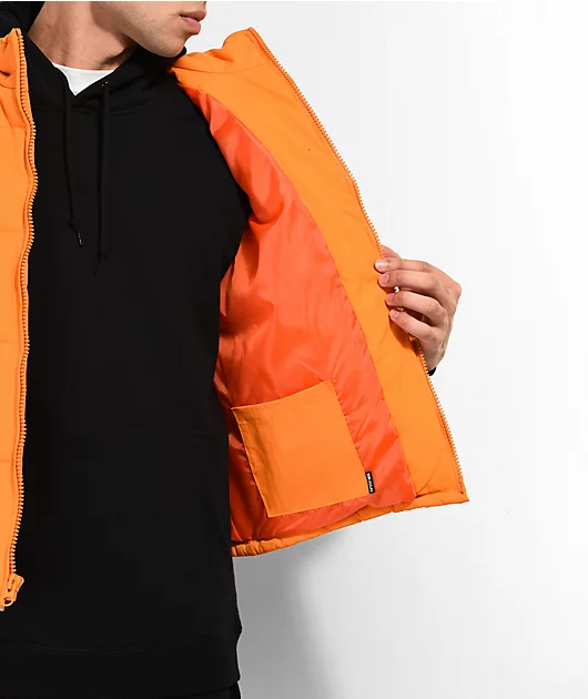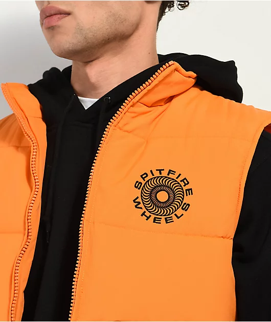 The Spitfire Swirl puffer vest comes in a bright orange colorway, with bold swirling embroidery on the back. Additional branding is embordered on the left chest, as the insulated silhouette has a full zip design and a mock neck collar. A slightly shorter