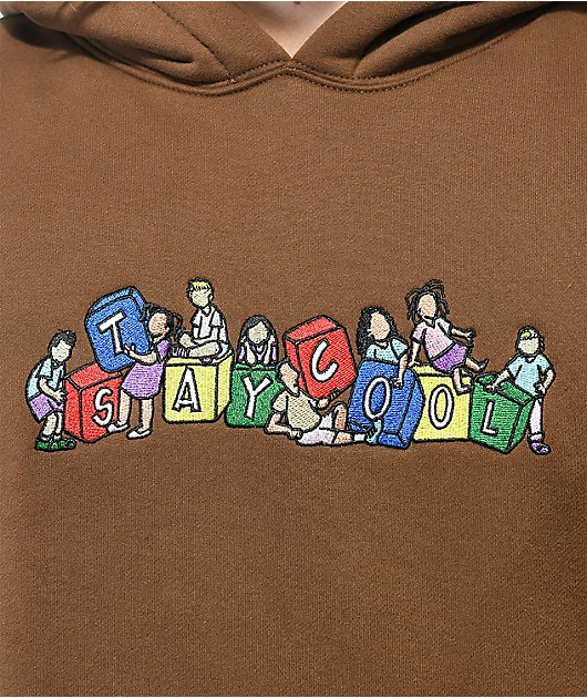 From Staycoolnyc comes the Elementary brown hoodie in an extremely soft cotton blend fabrication. The loose fitting hoodie features an embroidered graphic on the chest of children playing with large blocks, spelling out \”Stay cool.\” The Staycoolnyc sweats