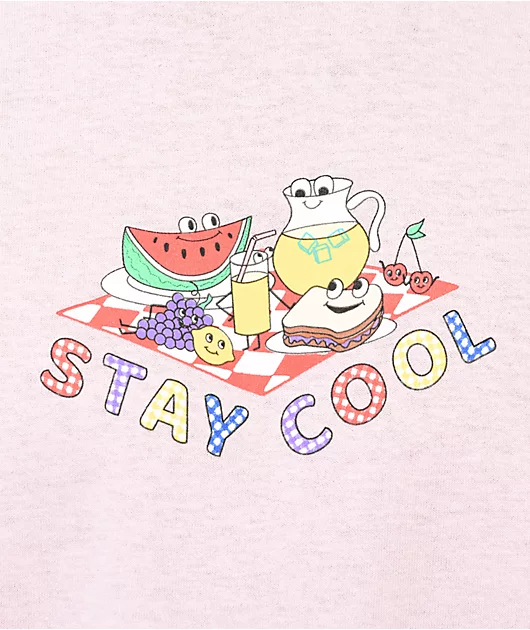 The Picnic t-shirt from Staycoolnyc is made of 100% cotton and comes in a pink colorway with a screen-printed graphic of personified picnic foods on a blanket for a whimsical look.