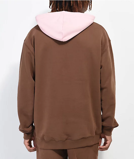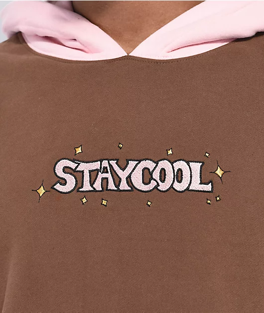 The Sparkle hoodie from Staycoolnyc comes in a brown colorway with a pink hood and embroidered script across the chest that reads, \”Stay cool\” surrounded by gold sparkle icons. This hoodie has a fixed hood and a kangaroo pouch pocket for a snug, comfortab