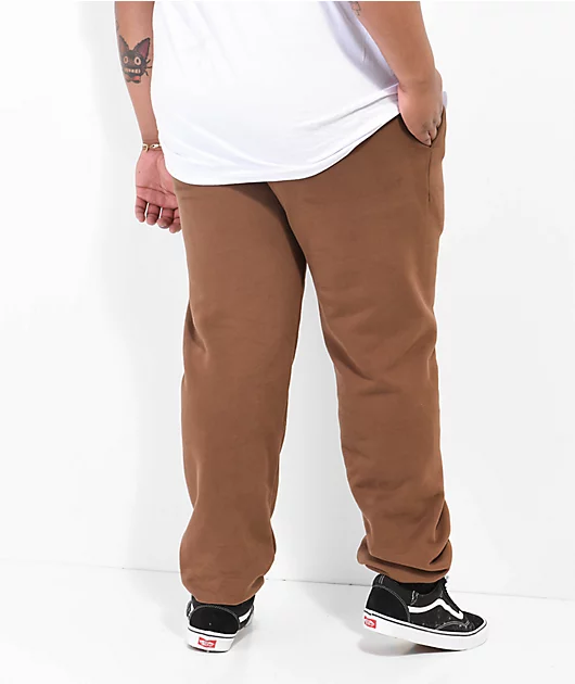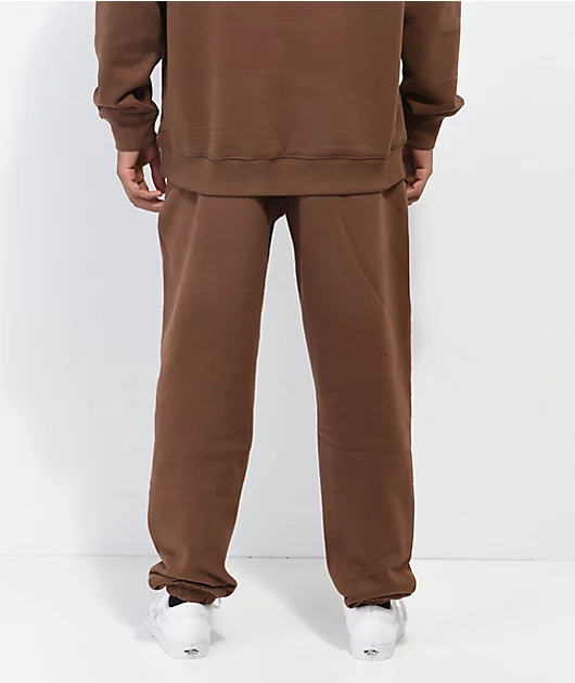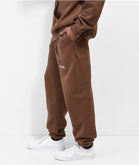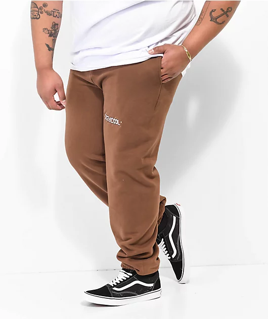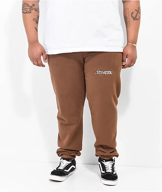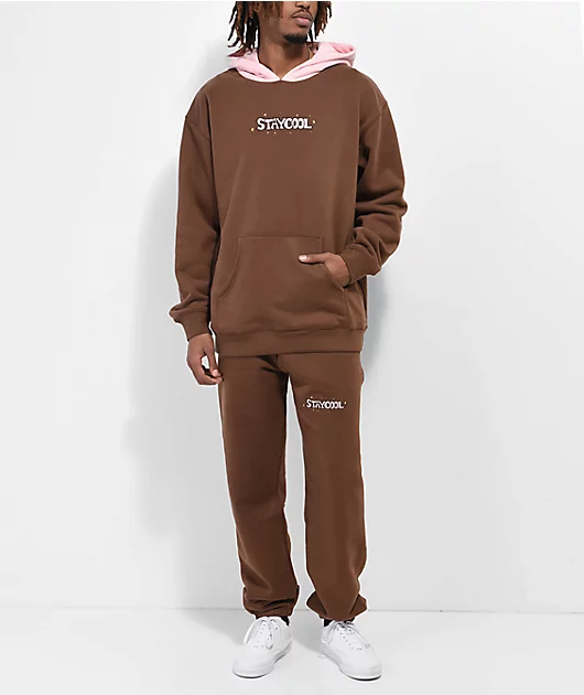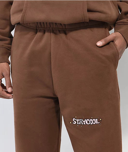 The Sparkle sweatpants from Staycoolnyc come in a brown cotton-poly construction with an elastic waistband and leg openings; the perfect addition for any winter closet. Adorning the left thigh is embroidered script reading, \”Stay cool\” in pink, amongst go