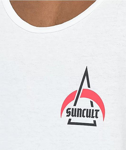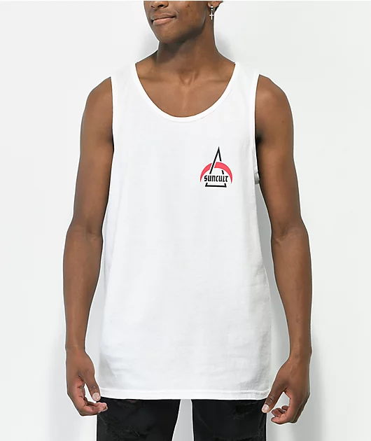 Lifestyle brand, Suncult, presents the Taken Away white tank top made from a breathable construction and a tagless neckline for an irritation-free fit. A Suncult triangle logo is printed at the left chest, while the back features a blue dragon holding a w