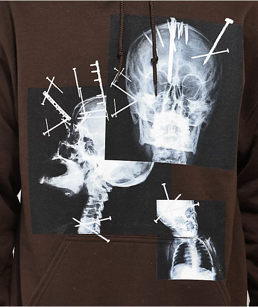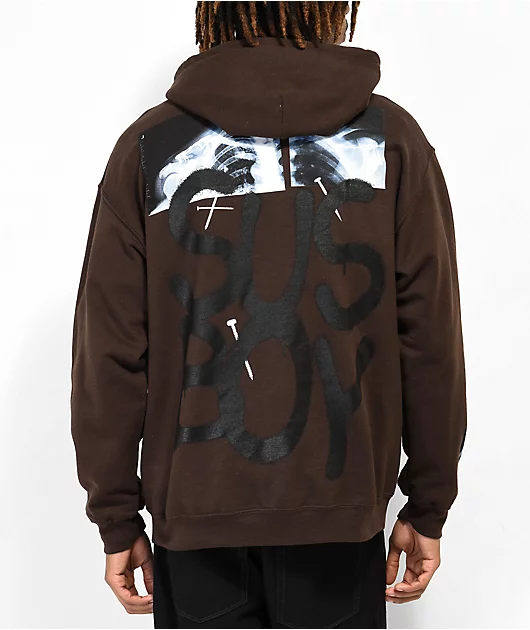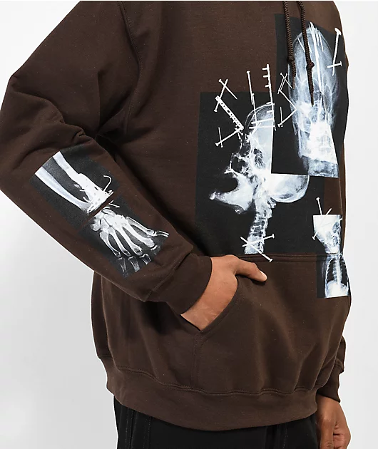 The X-Ray SUS BOY hoodie comes in a dark brown colorway with screen-printed x-ray graphics across the front, back, and right sleeve. This 100% cotton hoodie has a drawstring-adjustable hood and a kangaroo pouch pocket for a classic pullover construction.