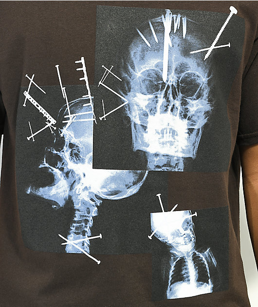 The X-Ray SUS BOY t-shirt is made of 100% cotton and features a dark brown colorway. This shirt boasts a screen-printed graphic on the front of various x-rays depicting skulls imbedded with nails, and on the back of shoulder x-rays and spray painted \”SUS