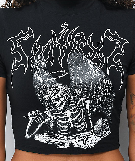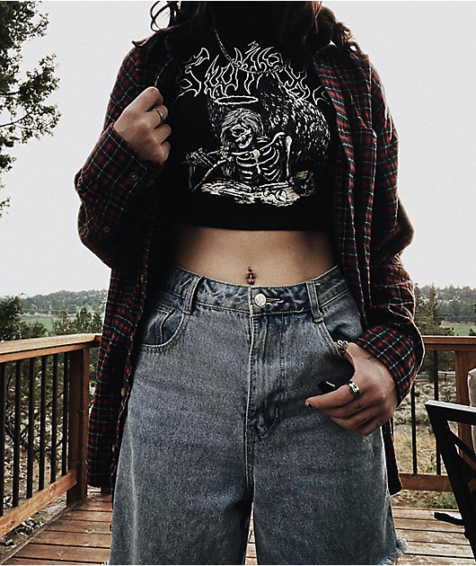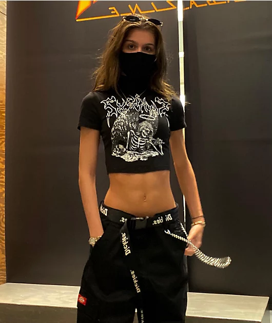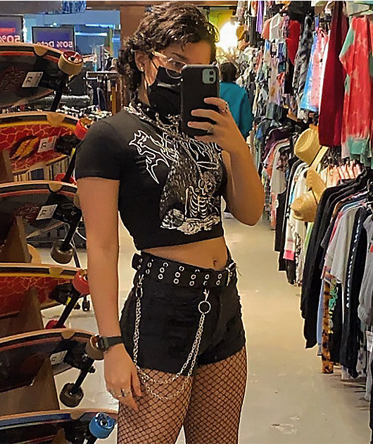 Toss a tormented touch into your rotation of tops with SWIXXZ’s Best Wishes buckle black mock neck crop top! The top’s mock-neck collar and cropped hemline add an interesting twist to the silhouette, while the soft, cotton construction keeps the top light