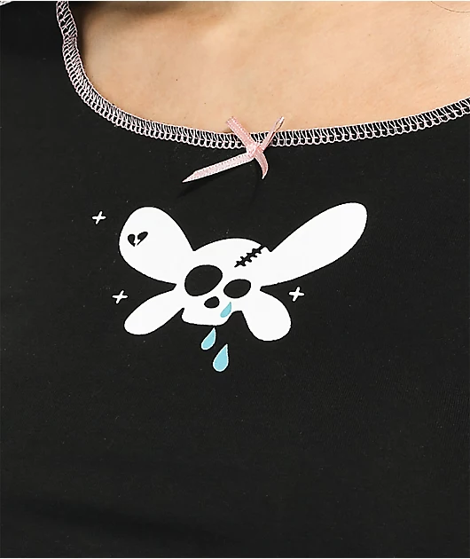 The Dark And Cutesy SWIXXZ t-shirt comes in a cropped, long sleeve construction with a black colorway featuring pink stitching and a screen-printed graphic on the front of a crying animal skull.