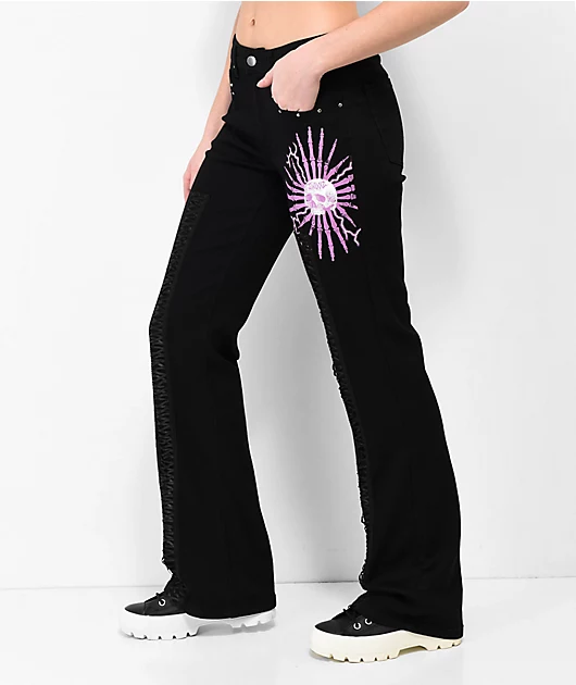 SWIXXZ offers the Raise Hell jeans in a black denim construction, showing off a colorful screen-printed graphic of a skull and bones in a purple accent that draws the eye. These cool pants have a lace detailing down both thighs that completes the 90’s gru