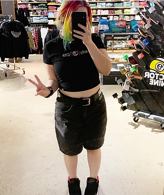 The Skull SWIXXZ t-shirt comes in a slim, crop construction with a black colorway boasting a rhinestone graphic across the chest of a skull and flames. This crop top is made of a soft, cotton-spandex fabrication with a classic crewneck collar for an early