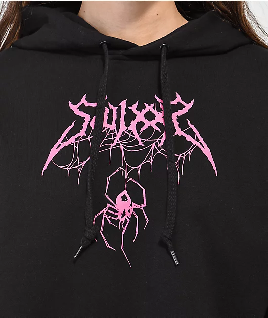 The Spider SWIXXZ hoodie comes in a crop construction made of 100% cotton with a black colorway for an edgy look. Adorning the front of this hoodie is a screen-printed graphic of a spider hanging down from brand script in a hot pink.