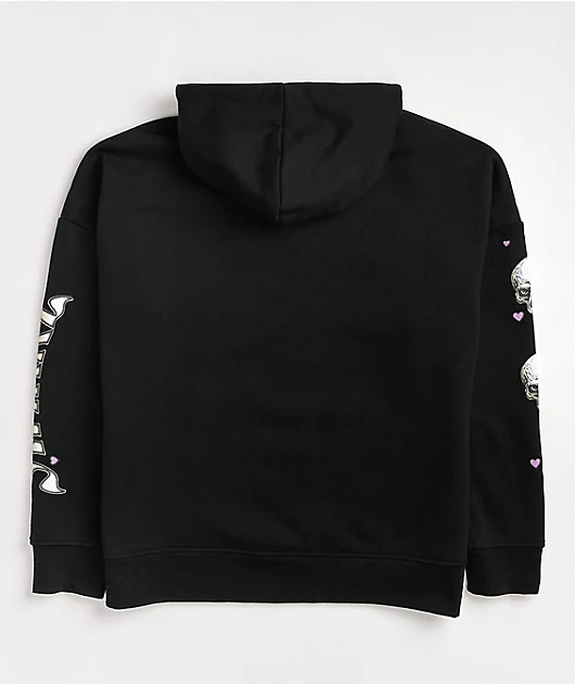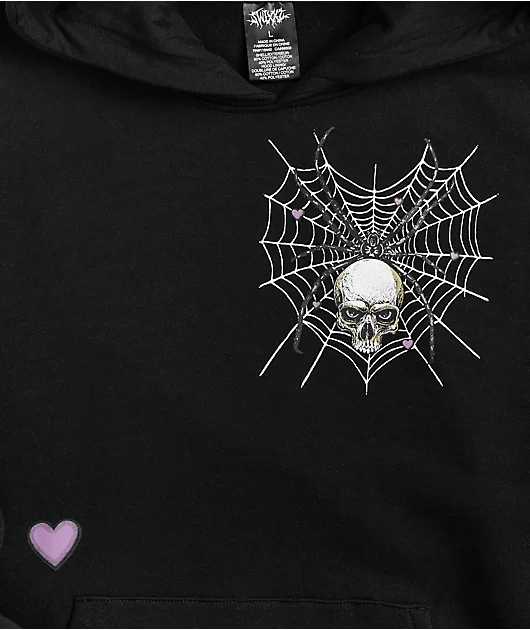 The Tangled Skull hoodie from SWIXXZ by Maggie Lindemann has a black colorway with screen-printed graphics of skulls and hearts decorating the right sleeve, the SWIXXZ logo descending down the left, and a graphic of a skull nestled into a spider’s web on