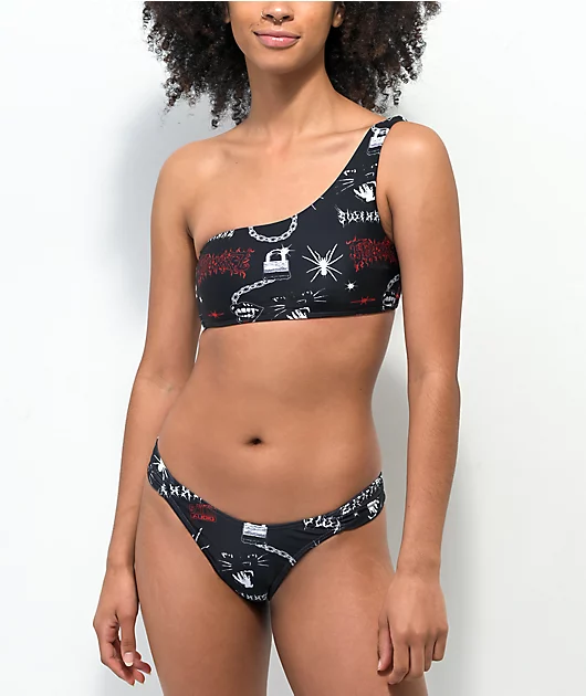 The Trouble bandeau bikini top from SWIXXZ features a single shoulder strap design in a bandeau-style silhouette, and comes in a black colorway with classic SWIXXZ logos in red and white font throughout.