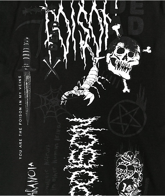 Turn the edge knob up on that wardrobe with the Tattoo Poison black t-shirt from Teen Hearts! A huge graphic appears at the chest, showing \”Poison\” script, a scorpion, skull-and-crossbones, and dagger, among other items, giving this shirt some truly strik