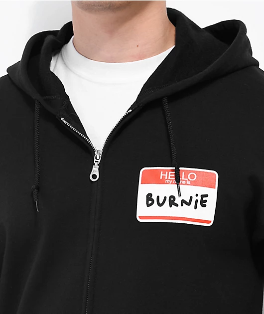 From The High & mighty comes the Burnie zip hoodie in a sleek black colorway, showing the image of a name tag with the name \”Burnie\” written across it in black marker. On the back side is the image of the well know character, Burnie, with red eyes and a s