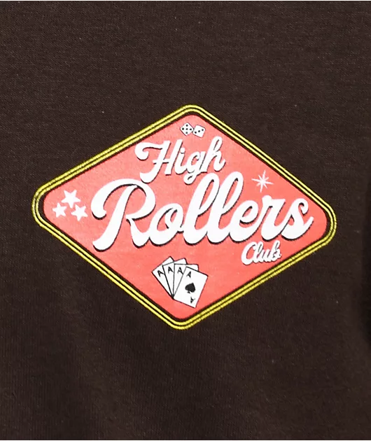 The High Rollers t-shirt from The High & Mighty comes in a brown colorway with a small logo on the left of chest and a screen-printed back graphic of dice with red eyes and script reading, \”How high can you get?\” This shirt is made of 100% cotton and