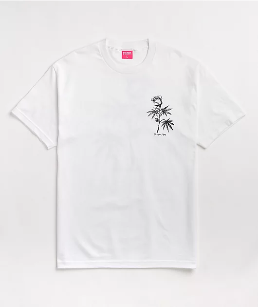 Pick up some unique, hybrid style with the Rosebud white t-shirt from The High & Mighty! This white tee features a rose at the left chest and back, with glorious weed leaves growing off the stem instead for some fun, smell-good style.