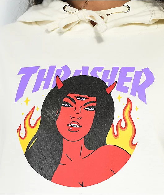 The Roja Logo Thrasher hoodie has a relaxed fit, a hood with adjustable drawstring, and a kangaroo pouch pocket. This Thrasher Magazine hoodie comes in a bone off-white colorway with screen-printed brand text and a three-eyed devil woman graphic on the ch