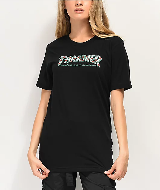 Represent your love for Thrasher with the Roses Black Boyfriend Fit T-Shirt. With a white script logo screen-printed across the chest with rose images throughout, this tee is a great way to show your love for skateboard style in floral fashion.