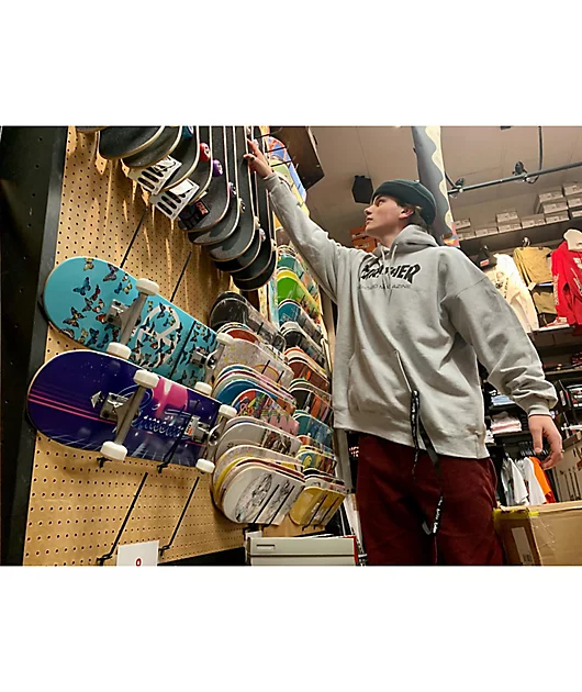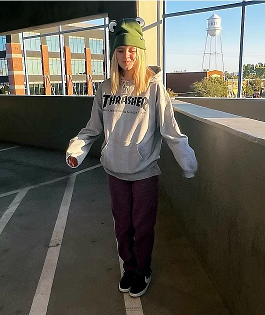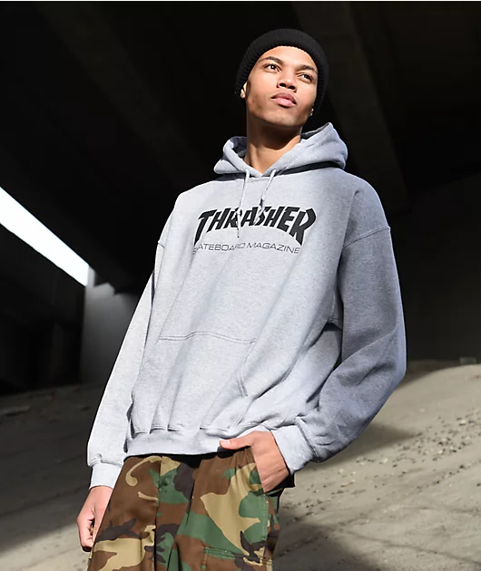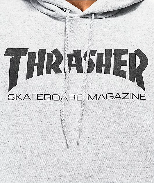 Skate in iconic style with this light grey Thrasher Skateboard Mag pullover hoodie. The black Thrasher Magazine logo graphic on the upper chest is a perfect way to showcase your skate roots while the soft fleece lining adds a ton of comfort.