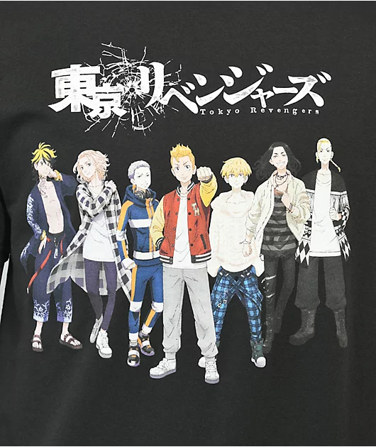 From Tokyo Revengers comes the Group t-shirt in a black colorway featuring the Manji Gang and a young Hanagaki standing in the center. The soft cotton shirt is bolstered with double-stitched hems and a tagless ribbed collar for all-day comfort.