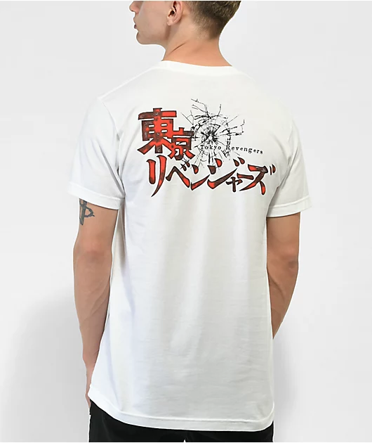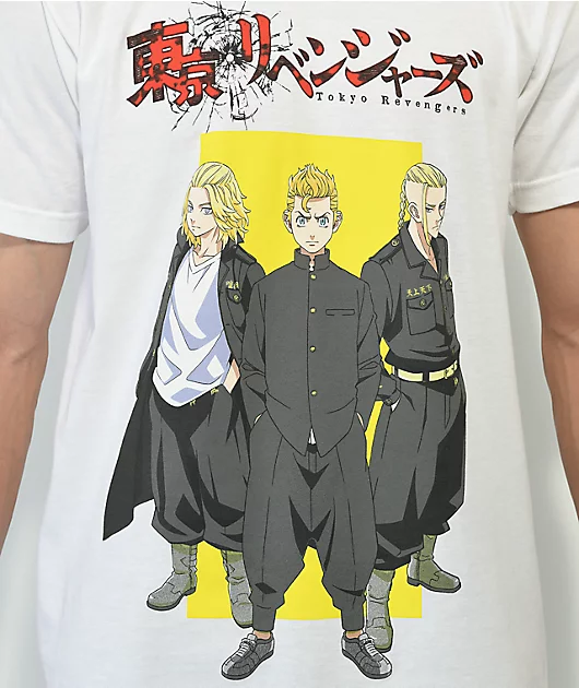 The Tokyo Revengers white t-shirt features a screenprinted geaphic of the Tokyo Manji Gang against a yellow background on the front, with a red Tokyo Revengers logo in Japanese across the chest and back. The Toman tee features double stitching along the