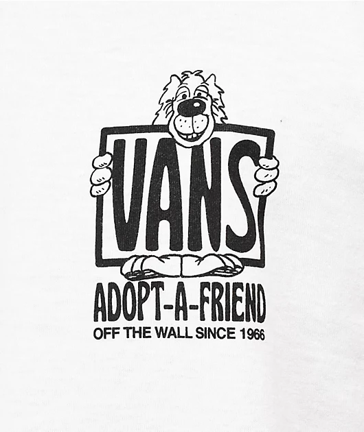From Vans comes the Adopted A Friend t-shirt in a crisp white colorway, showing off a graphic of a dog holding up the brand name with script below that reads \”Adopt-a-friend | off the wall since 1966.\” On the back of this graphic tee is a graphic of a sm