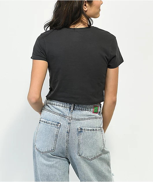 From Vans comes the Brimstone crop t-shirt in the grey colorway. The crop top t-shirt has an orange fire-breathing dragon design on the front, with circular script reading \” Vans since nineteen sixty six.\” The cropped shirt by Vans comes in a slim stretch