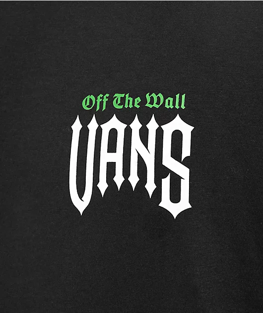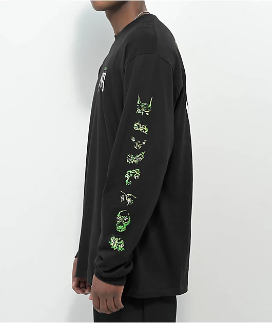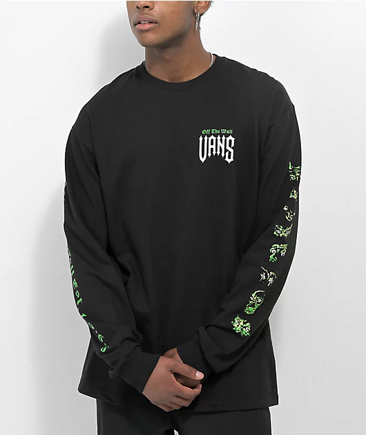 The Eyes In The Dark t-shirt from Vans comes in black colorway classic long sleeve construction. The shirt features Vans logo script at the left chest as well as the back, and green eye graphics reside along both sleeves.