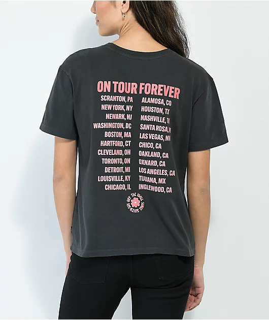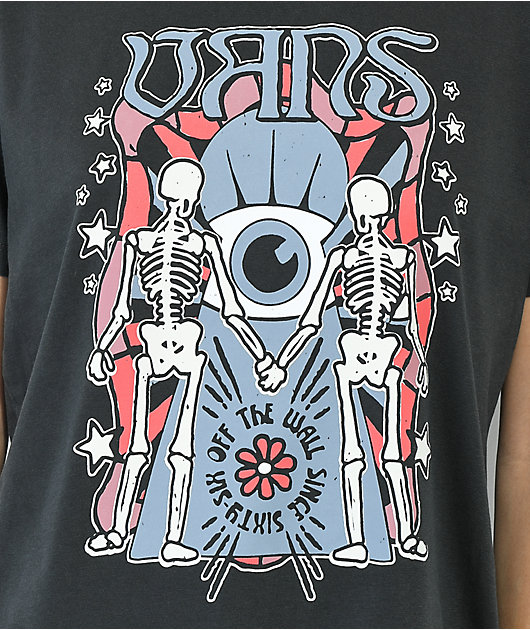 The Gem N Eye t-shirt from vans comes in a black colorway with a washed effect throughout. The Vans tee features a front graphic of two skeletons holding hands, a large keyhole with an eye peeking through, and Vans written in a blue art nouveau script at