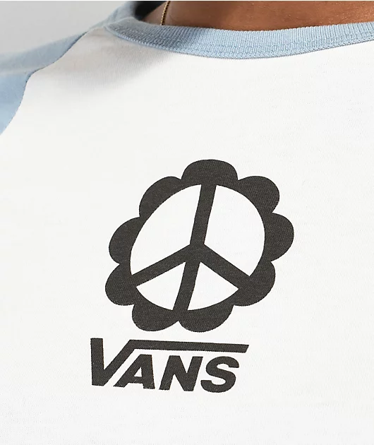 The Grow Peace Vans t-shirt comes in a long sleeve crop construction with blue raglan sleeves and a white colorway. Adorned across the chest is a screen-printed graphic of a peace sign flower and brand script. This 100% cotton t-shirt has a boxy, cropped