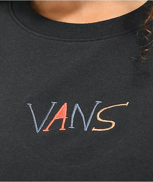 Pick up the Vans Hanna Scott black long sleeve t-shirt and pop some color into your ‘fit! This black long sleeve features a multi-colored, embroidered Vans logo across the chest, and a screen-printed, stained-glass-style graphic at the black, lending this