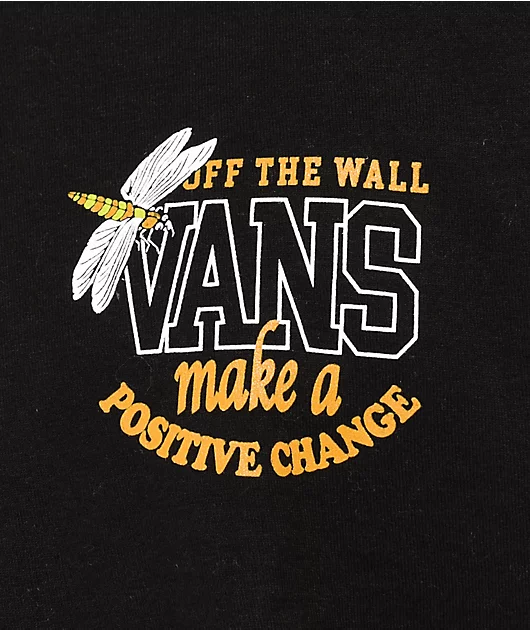Vans brings the Positivity Dept t-shirt in a sleek black colorway, showing the brand name left of chest with a graphic of a dragon fly and script that reads \”Make a positive change.\” On the back of this graphic tee is more script that reads \”Positivity De