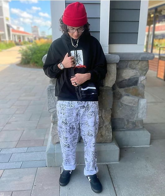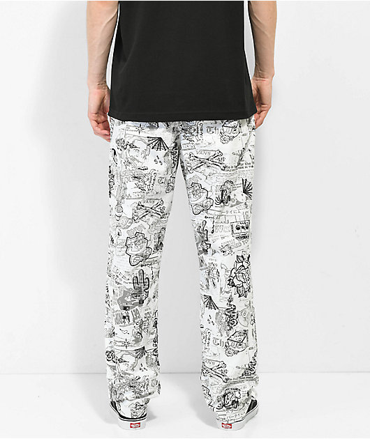 Vans collaborates with BMX rider Kevin Peraza for the Range Elastic pants in a white colorway with black doodle print. Various black ink drawings such as skulls, roses, and cacti can be seen throughout the cotton pants, as an elastic drawstring waist ensu