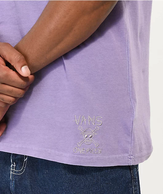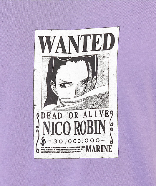 Vans and One Piece bring you this every day t-shirt in a violet colorway, displaying a graphic of a wanted poster with Nico Robin’s face, along with text reading \”Wanted/dead or alive\” along with a high sum of money as a reward. On the bottom hem is embro