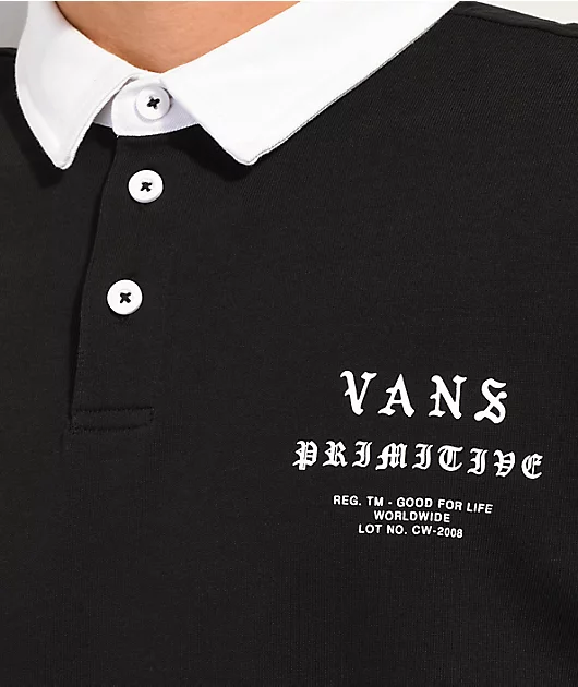 This rugby shirt from the Vans x Primitive collection features a black long sleeve construction with a contrasting white turn down collar. Collaborative brand text is screen-printed on the left chest, while a large outline of Primitive’s Dirty P logo appe