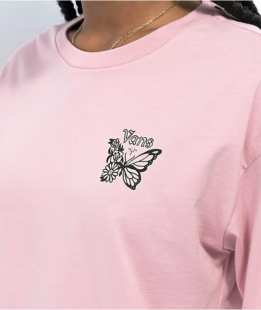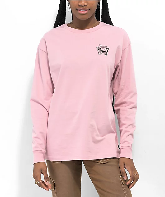 The Zattoo long sleeve t-shirt from Vans comes in a pink colorway with a black butterfly logo on the left of chest and a collage of back images including roses, handcuffs, and that same butterfly. This 100% cotton t-shirt features the brand’s classic fit