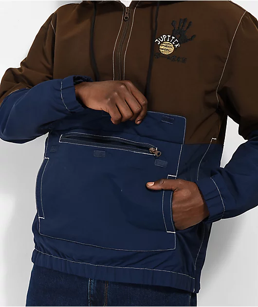 The Zion jacket from Vans comes in a dark brown and blue colorway and has a anorak-style silhouette with two front slash hand pockets and a pouch pocket at the front with a hook-and-loop closure at th