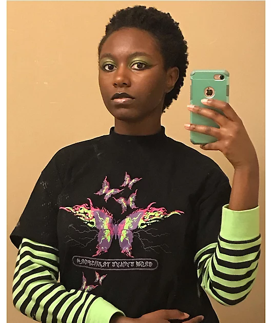 Fire up your favorite ‘fits with the Vitriol Bixie black & green layered long sleeve t-shirt. This funky fit features a screen-printed graphic of a flaming butterfly on the center chest for a wild look, while the black and green striped long sleeves provi
