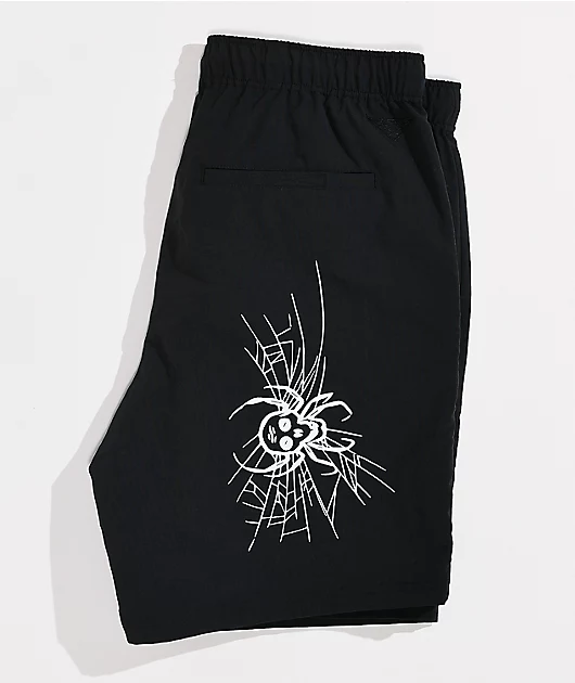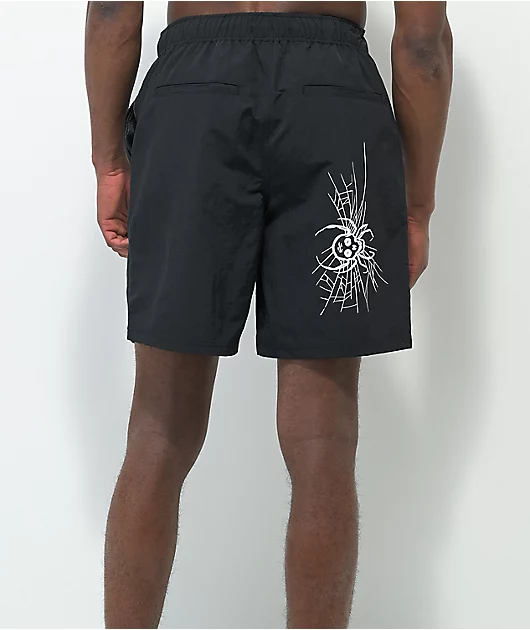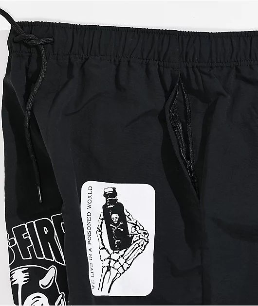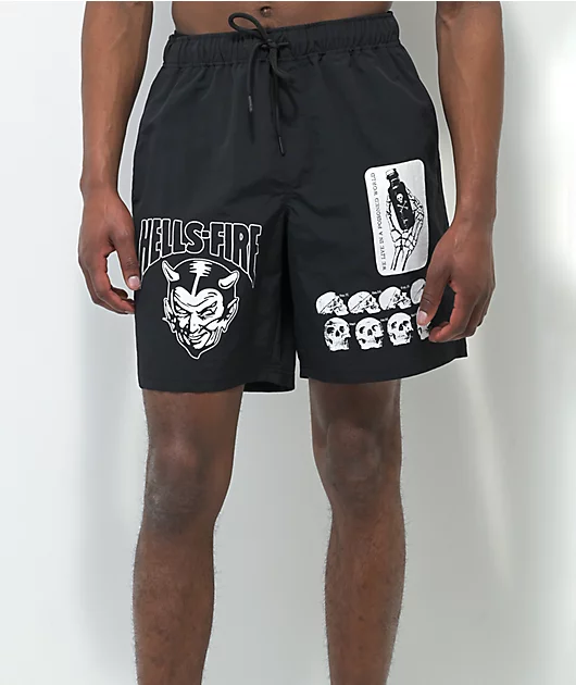 These black Fusion board shorts from Vitriol come in a black colorway that’s outfitted with skulls on the left leg, a devil and \”Hells-fire\” on the right, and a spider and spider web on the back of the right leg. These swim trunks are made from quick-dryi