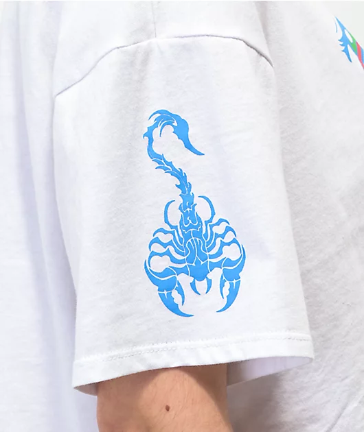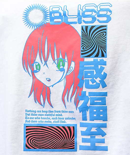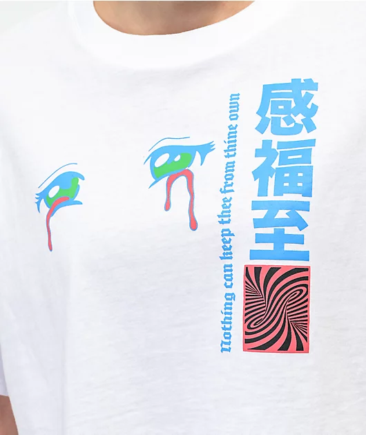 The Vitriol Georgia Anime crop t-shirt has a boxy, cropped fit, with oversized sleeves, and is made from soft, lightweight cotton. It has a white colorway that is replete with graphics and script throughout, like a pair of bleeding eyes on the front, an a